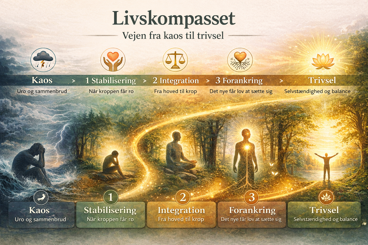 Andre gange om at forstå mønstre eller give slip på det, der spænder. Det vigtigste er at du kan mærke, at du ikke står alene i det, der sker.